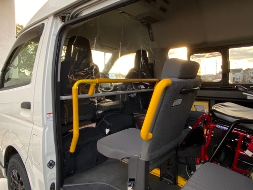 車内の換気用バイザーを取り付け、車内での会話による飛沫感染を防止するためのシートを取り付けてありますので安心、安全に乗車して頂けます。